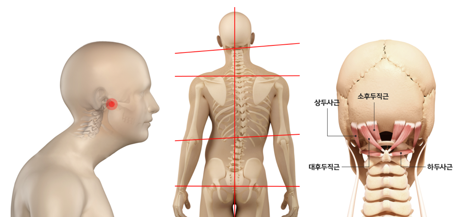 머리가 앞으로 나오면 몸통과 머리를 연결한 근육이, 얼굴을 몸통쪽으로 잡아당기게 됩니다.