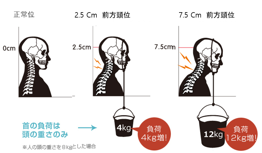 머리가 몸의 중심에서 멀어질수록 머리 무게에 중력의 영향이 점점 증가합니다. 머리가 앞으로 나간 거리가 늘어날 수록 머리를 잡고 있는 근육이 실감하는 무게가 점차 늘어나게 되는 것입니다.(모멘트 증가)